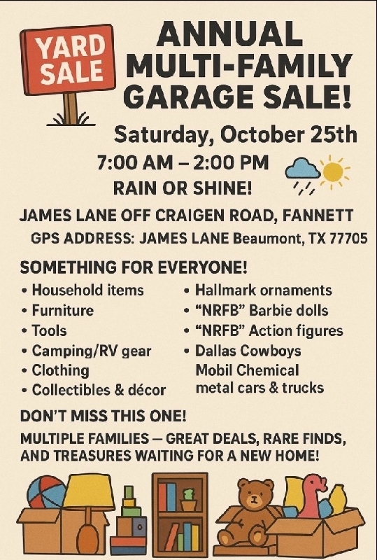 ~*NEIGHBORHOOD GARAGE SALE*~ James lane in Fannett annual neighborhood garage sale happening THIS SATURDAY 10/25 7-1 rain or shine, and Greg Bostwick says the rain isnt coming until that afternoon so come on out! 6 homes participating and there's always awesome deals to be had. Park and walk from house to house. 1234