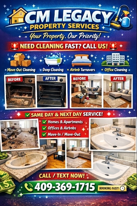 Professional Cleaning Services Need your home or property cleaned FAST? CM Legacy Property Services delivers reliable, detailed cleaning with same-day availability. Whether it's a move-out, deep clean, or Airbnb turnover—we get it done right the first time. Move-In / Move-Out Cleaning Deep Residential Cleaning Office & Commercial Cleaning Airbnb Turnovers Fast • Reliable • Professional Limited spots available this week Call/Text: 409-369-1715 Serving Port Arthur, Nederland, Groves & Beaumont Your Property. Our Priority.