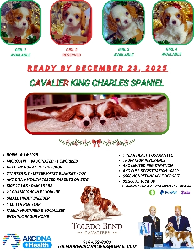 AKC CHAMPION BLOODLINE CAVALIER KING CHARLES SPANIEL Toledo Bend Cavaliers BREEDING SINCE 2006 I am Susan, the breeder of Toledo Bend Cavaliers, situated in the picturesque region of deep east Texas. Our cherished puppies are nurtured within our home, receiving extensive socialization, and are raised with abundant love. Cavaliers are known to bring immeasurable joy to the lives of those fortunate enough to welcome them, and it would be our pleasure to assist you in finding the ideal companion for your family. Toledo Bend Cavaliers 3000.00