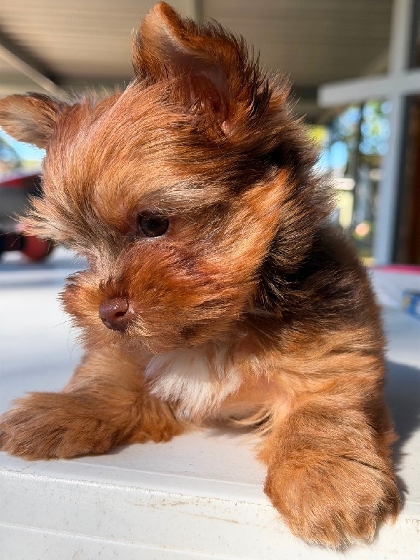 AKC Male Micro Yorkie Ready Now! Little Cayenne is a very Stunning Chocolate Sable colored Yorkie baby boy. He is AKC Registered, has had first vaccination, deworming, tail docked, dewclaws removed and wee pad trained. Cayenne is Microchipped and is such loving little baby boy. This could be your little prince , I am in Beaumont Tx text or call 409-791-3944. He has been vet checked and with 1st set of puppy vaccinations! Just stunning! He is the whole package! Healthy and all puppy shots and so cute & love to cuddle ! Spoiled little baby! New current pics are on the ad just taken today! He will be about 4 lbs. Comes with 4- generation pedigree and a very generous puppy package, food, vet records, shot record, toys and favorite blanket! 2500