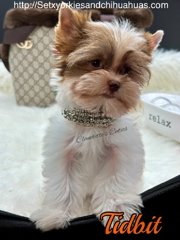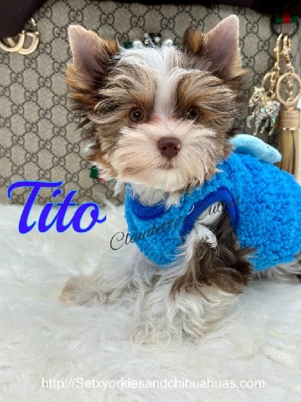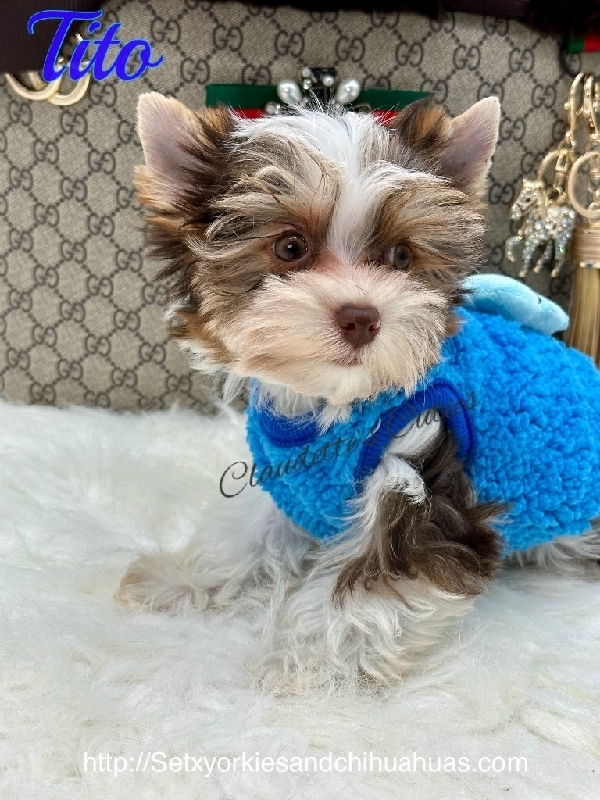 AKC Micro Stunning Male Yorkies These tiny boys are individually uniquely colored Stunning male Yorkies. They are AKC Registered, will come with first vaccination, deworming, tail docked, dewclaws removed and wee pad trained. They are Microchipped and are such loving little boys. This could be your little prince, I am in Beaumont Tx text or call 409-791-3944. They come vet checked and with 1st set of puppy vaccinations! Just stunning ! They are the whole package! Healthy and all puppy shots and so cute & love to cuddle ! Spoiled little baby boys ! Tito and Tidbit will be about 3.12 lbs. Comes with 4- generation pedigree and a very generous puppy package, his food, vet records, shot record, toys and favorite blanket! Located in Beaumont Tx 409-791-3944. Tito is $2300 2000