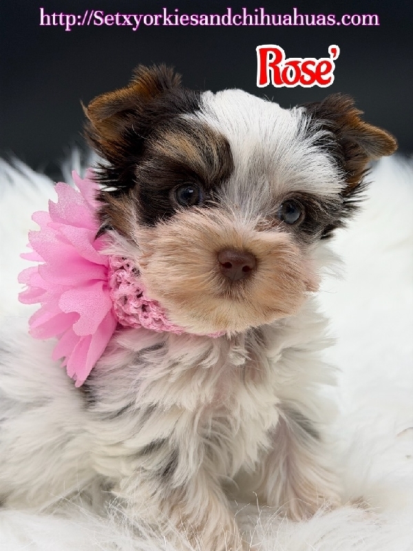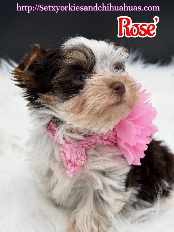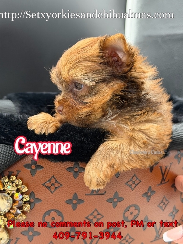 AKC Micro Yorkies Ready Now! Little Rose' and Cayenne are Stunning Chocolate Parti and Sable colored Stunning Yorkie babies a boy and a girl. They are AKC Registered, has had first vaccination, deworming, tail docked, dewclaws removed and wee pad trained. They are Microchipped and is such loving little babies. This could be your little prince or princess , I am in Beaumont Tx text or call 409-791-3944. They have been vet checked and with 1st set of puppy vaccinations! Just stunning! They are the whole package! Healthy and all puppy shots and so cute & love to cuddle ! Spoiled little baby! New current pics are on the ad just taken today! They will be about 4 lbs. Comes with 4- generation pedigree and a very generous puppy package, food, vet records, shot record, toys and favorite blanket! Cayenne is $2500 2800
