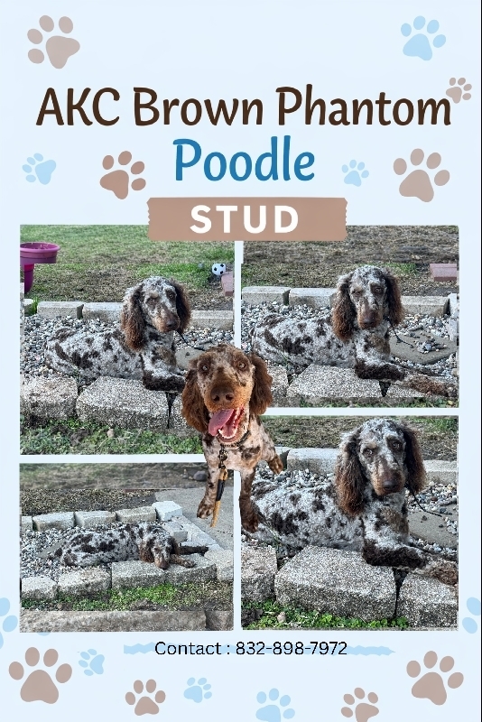 AKC Poodle Stud AKC Registered Brown Chocolate Phantom Moyen Poodle available for stud service. He is a handsome, well-structured male with a rich brown phantom coat, excellent pigment, and a dense curly coat typical of the breed. He has a wonderful temperament—intelligent, friendly, and confident—making him a great representative of the Poodle breed. He is athletic, healthy, and produces beautiful color and coat traits. 500