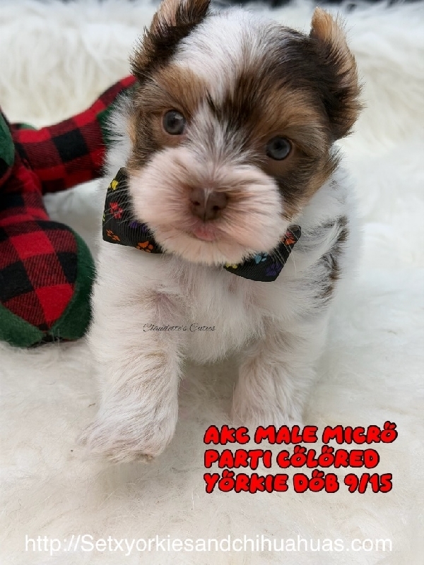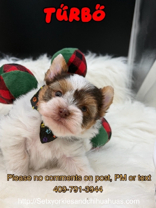 AKC Registered Micro Yorkies These tiny boys are individually uniquely colored Stunning male Yorkies. DOB 9/15 They are AKC Registered, will come with first vaccination, deworming, tail docked, dewclaws removed and wee pad trained. They are Microchipped and are such loving little boys. This could be your little prince, I am in Beau- mont Tx text or call 409-791-3944. They come vet checked and with 1st set of puppy vaccinations! Just stunning! They are the whole package! Healthy and all puppy shots and so cute & love to cuddle ! Spoiled little baby boys! New current pics are on the ad just taken today! They will be about 4 lbs. Comes with 4- generation pedigree and a very generous puppy package, food, vet records, shot record, toys and favorite blanket! 2500