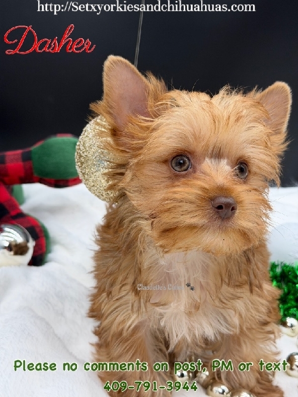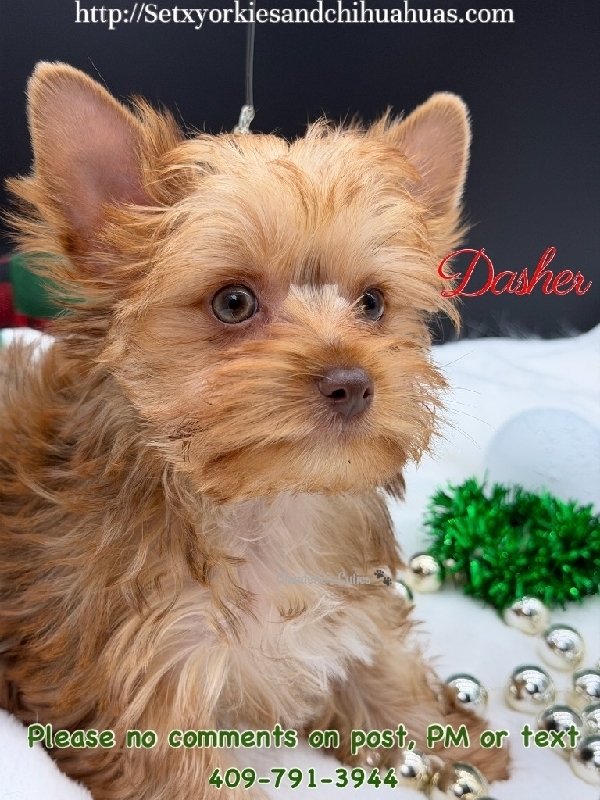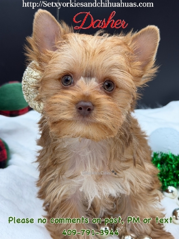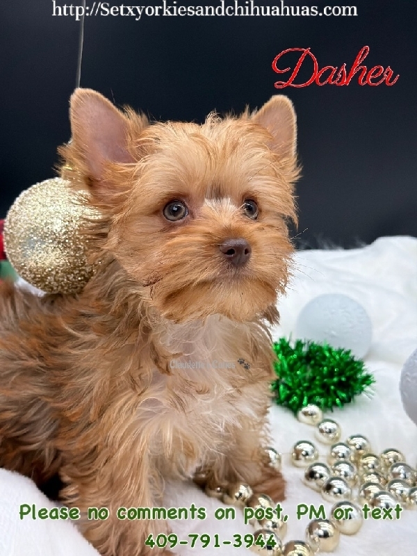 AKC Stunning Male Yorkie Little Dasher is Chocolate Sable colored Stunning male Yorkie baby boy. He is AKC Registered, has had first vaccination, deworming, tail docked, dewclaws removed and wee pad trained. He is Microchipped and is such loving little boy. This could be your little prince, I am in Beaumont Tx text or call 409-791-3944. He has been vet checked and with 1st set of puppy vaccinations! Just stunning! He is the whole package! Healthy and all puppy shots and so cute & love to cuddle ! Spoiled little baby boys! New current pics are on the ad just taken today! He will be about 4 lbs. Comes with 4- generation pedigree and a very generous puppy package, food, vet records, shot record, toys and favorite blanket! 2000