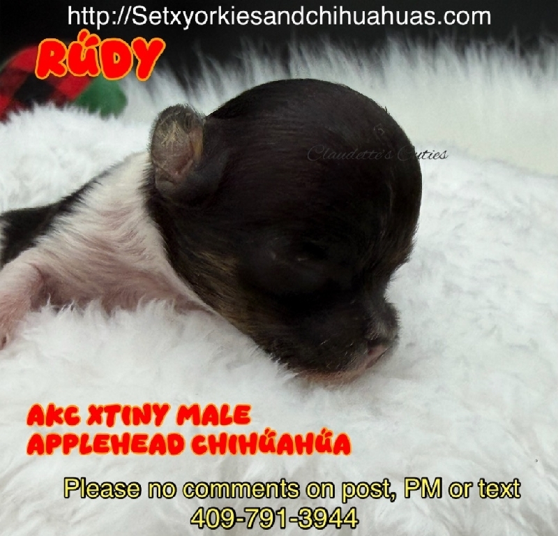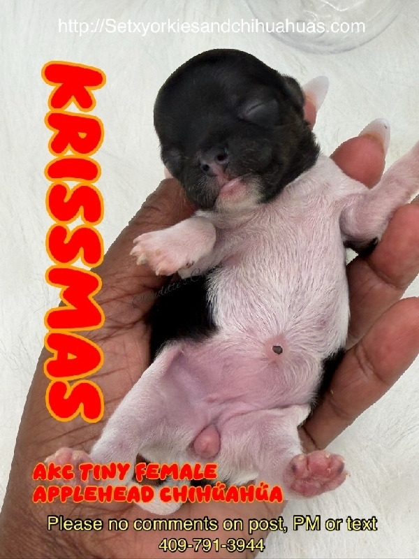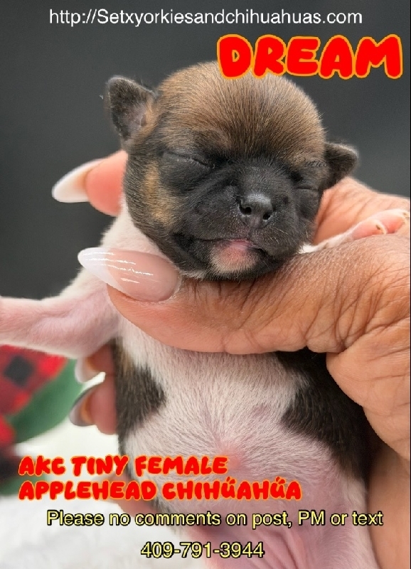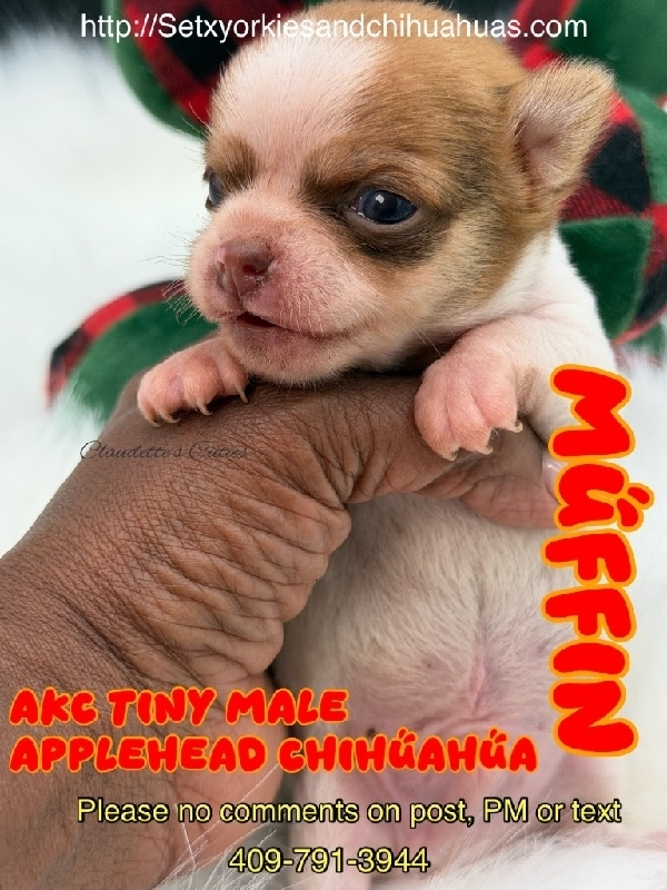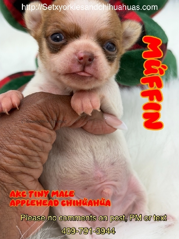 AKC Tiny Applehead Smooth Coat Chihuahuas AKC Registered Applehead Chihuahuas, perfect dome heads. These Beautiful babies will come with 1st vaccination, deworming pre loved and wee pad trained. You can reserve one of these gems to put under your tree in Christmas Eve with a deposit. Located in Beaumont Tx 409-791-3944 2800