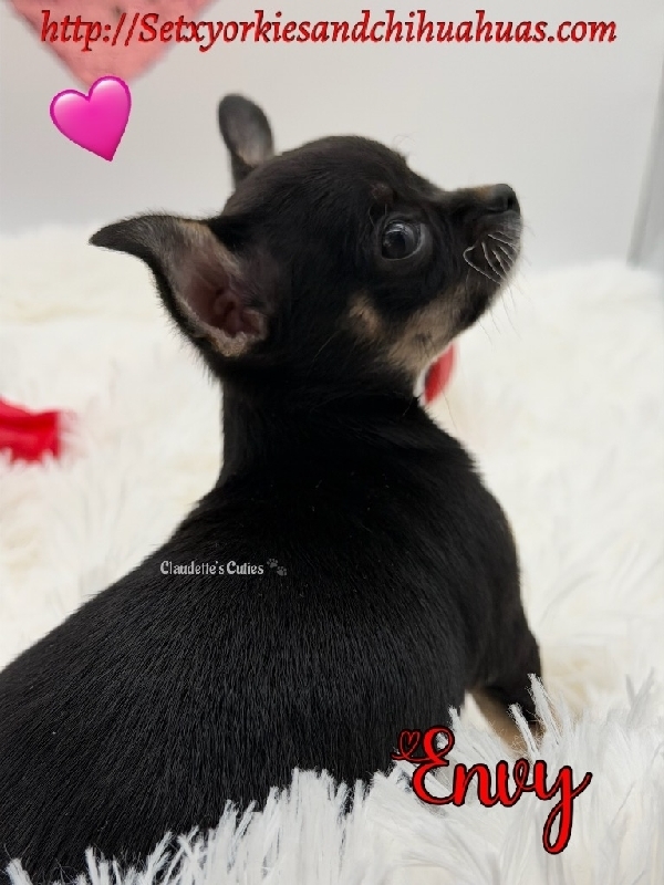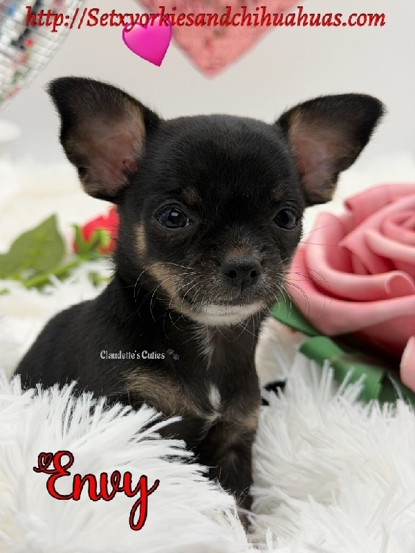 Beautiful AKC Female Black Tri Female Micro Chihuahua Sweet Miss Envy is a dream baby, perfect in every way. Charting 4 to 4 1/2 pounds, AKC Registered, perfect Gorgeous Black Tri color, the best temperament, an absolute sweetheart. Her DOB is 12/13, she has had her first round of vaccines, deworming and is already Microchipped. Envy comes with a 3 Generation Pedigree, 30 days is insurance a very nice puppy pack with carrier, blanket, toy, food, collar, bowls etc. This little girl is raised in my home, very well socialized and ready to make your dreams come true. 2500