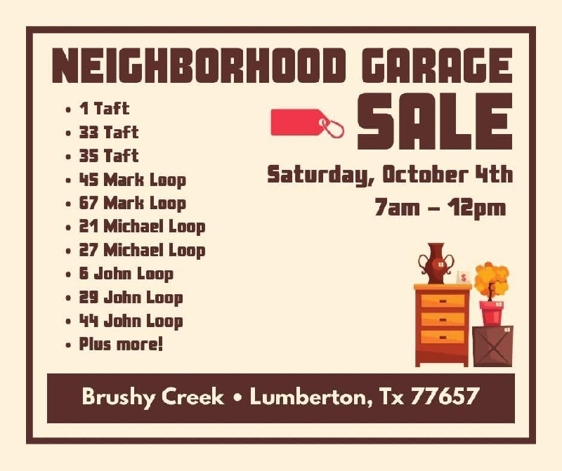 This Saturday, October 4th. Located in Lumberton, off West Walton - 15+ families having garage sales! Come see us bright and early at 7am!