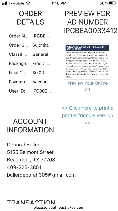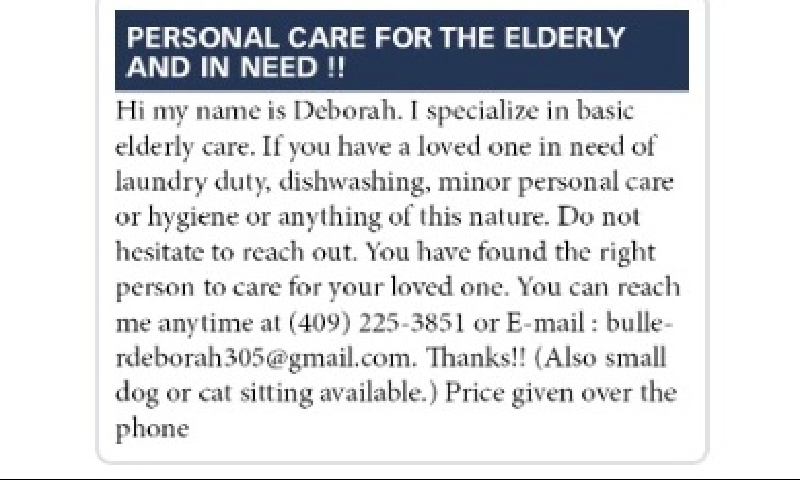Call Deborah! Hi, my name is Deborah. I specialize in basic elderly care. If you have a loved one in need of laundry duty, dishwashing, minor personal care or hygiene or anything if this nature. Do not hesitate to reach out. You have found the right person to care for your loved one. You can reach me anytime at (409) 225-3851 or E-mail: bullerdeborah305@gmail.com. Thanks!! (Also small dog or cat sitting available) Price given over the phone Prices given over the phone