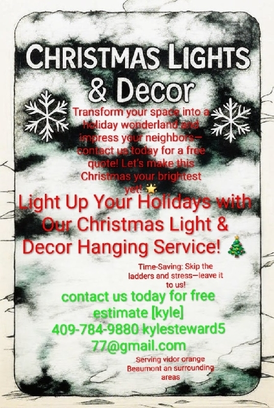 CHRISTMAS LIGHTS AND DECOR INSTALLATION WE are here to help light up your neighborhood with no hassle to you ,let us be your elves this Christmas holiday an deal with them ladders . We hang lights an all decor done at a professional standard .Free estimates we also come back an take down what we installed when your ready. Serving Vidor orange Beaumont an surrounding area. Vet an senior discounts pls ring a bell an we wheel fly over Estimate