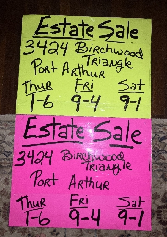 Estate Sale (April 23 thru 25th) Pt. Arthur Location: 3424 – Birchwood Triangle Port Arthur, Texas 77642 (One Block off of Jimmy Johnson Blvd., near 9th Avenue) When: Thursday, April 23rd – 1 p.m. to 6 p.m. Friday, April 24th – 9:00 a.m. to 4 p.m. Saturday, April 25th – 9:00 a.m. to 1 p.m. Appliances: Two Side-by-Side Stainless Steel Refrigerators, GE Washer and Electric Dryer, Air Fryer, One Large TV and Wall Mount, Several Smaller TVs, DVD & VHS Furniture: Wood and Iron Round Dining Room Table and Four Matching Chairs, High-back Upholstered Dining Room Chairs. Leather Loveseat and Matching Reclining Couch, several (all different) Upholstered Chairs, King Size Mattress and Box Spring with Wrought Iron Headboard and Footboard, King Size Modern Matching Four Piece Wooden Bedroom Suite both with Memory Foam Mattress, Pretty Open-Concept Wine Cabinet, Lightweight Metal Bench and Rocking Chair, Glass Desk. Miscellaneous: L.E. Smith "Moon and Stars" Canister Set and other blue pieces. Sango Dishes and Matching Canister Set, Women's Quality Clothing – Mostly Large and XL. Really nice Ladies Shoes - Sizes 7 to 8 – Birkenstock Betula, Birki's, Revere, Clarks, Keen, Taos, Enzo Agiolini, and Soft Walks. Housewares, Kitchenware, Nice Book Collection, Really Cute Gray Wigs, Toiletries, Bathroom Towels, Sheets, Blankets, Comforters, Home Décor, Stain Glass, Men Clothing, Artwork, Garage: Great Metal Freestanding Mailbox, Christmas Ornaments and Small Tree, Collection of Walkers, Wheelchair, Tools, Tera cotta Pots, Lots of Miscellaneous