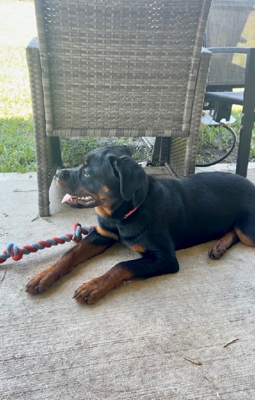 Female Rottweiler pup Wife's dog , she's a good dog but we're moving and won't have the space for her. She's house and kennel trained , and will come with her kennel and toys and bowl. Has first round of shots. Asking price is 400 but we're open to offers. We both work a lot so text is best. Reach us at 409-338-7978, or 409-434-0181 400 obo