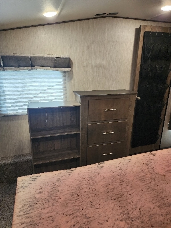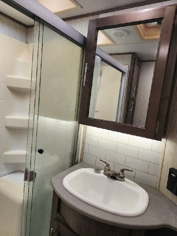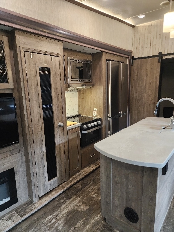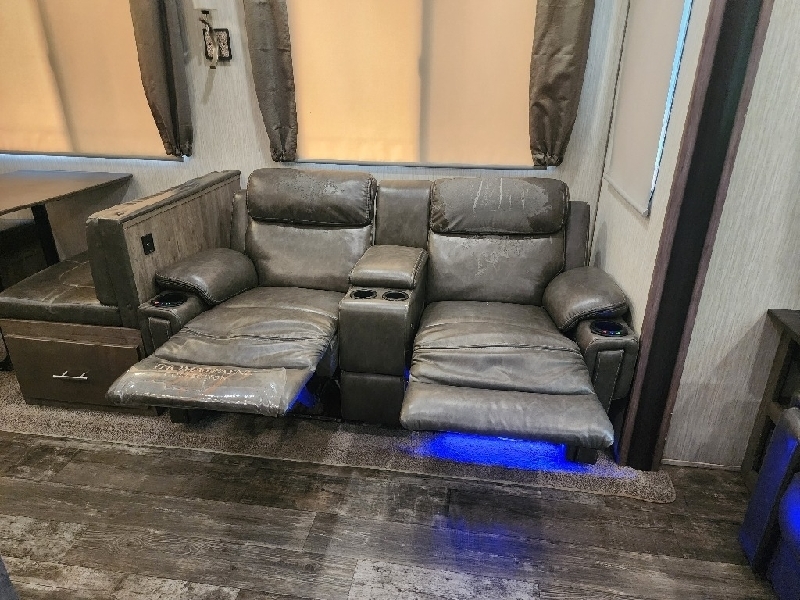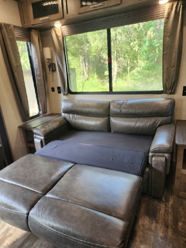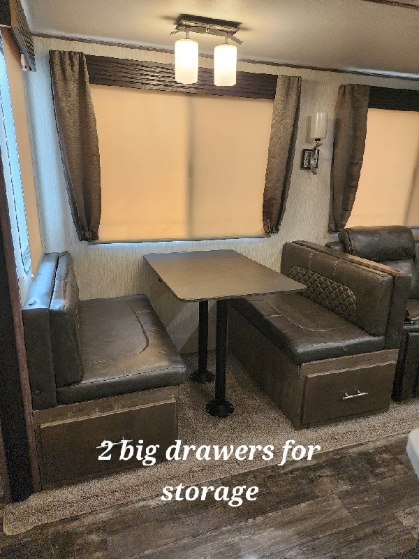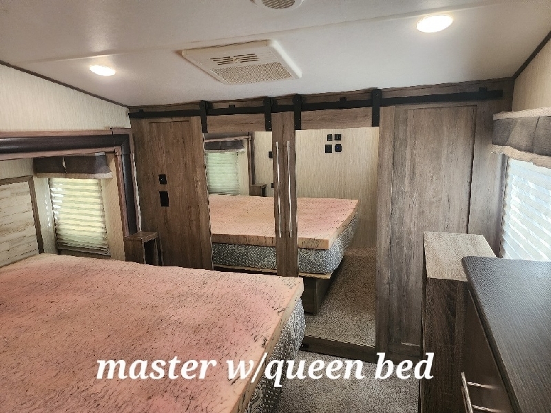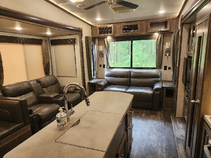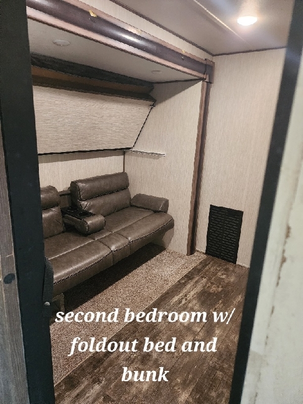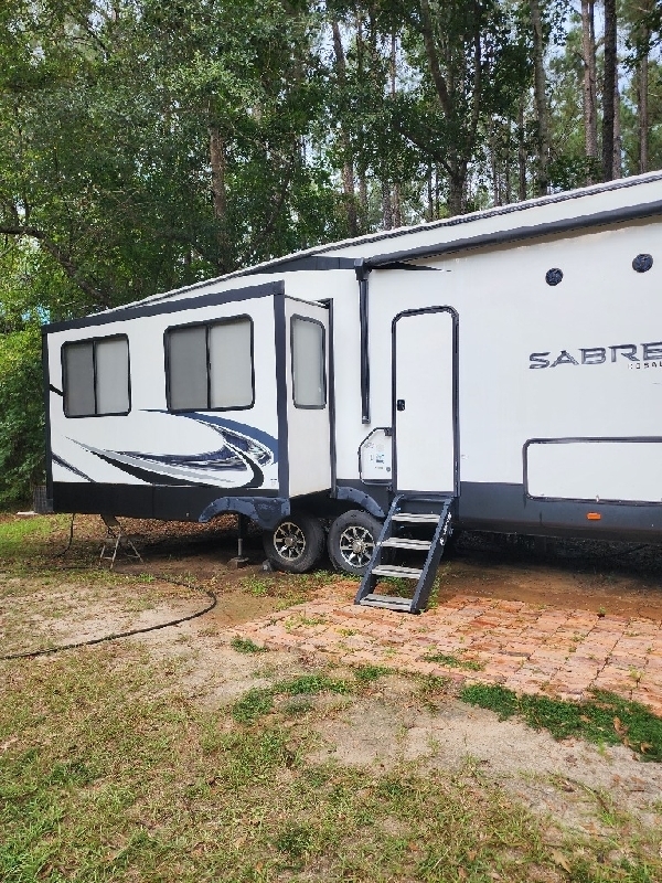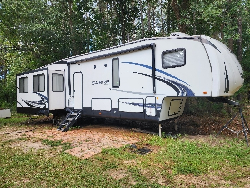 Forest River Sabre 2020 36BQH 5th wheel Clean title 42' overall 2 bedrooms 4 slides Dual a/c Tankless on demand gas hot water heater Full size refrigerator Gas stove and oven Recliners are heated and vibration 26" tv with outdoor speakers and media system Electric fireplace Storage above and behind tv Long drawers under table benches 3 storage areas above couch Large pantry 2 storage by stove Master has queen bed and washer and dryer hooked ups and tv hook up 2nd bedroom has couch folds out to bed and a bunk bed also has hanging storage and drawers. Tv hook up. 1 outdoor storage both side entry Dual propane tank storage and outdoor propane connection Outdoor kitchen w/mini fridge and TV hookup 32,000