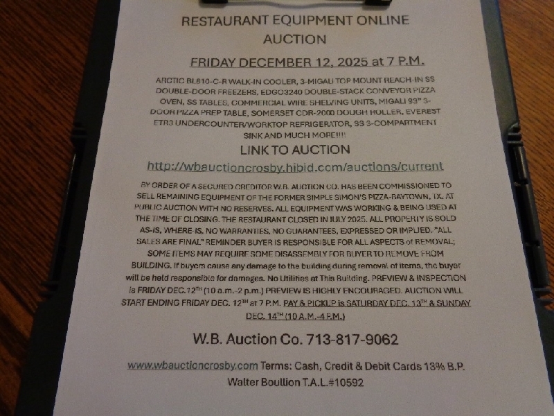 Former Simple Simon's Pizza-Baytown, TX. Online Auction Restaurant Equipment Online Auction-Former Simple Simon's Pizza-Baytown, TX. By Order Of A Secured Creditor To Be Sold At Public Auction With No Reserves. All items was working and being used at the time of closing in July 2025. All Items Sold As-Is, Where-Is, No Warranties, No Guarantees, Expressed or Implied. Link To Online Auction http://wbauctioncrosby.hibid.com/auctions/current W.B. Auction Co. 713-817-9062 Terms: Cash, Credit & Debit Cards 13% B.P. Walter Boullion T.A.L.#10592