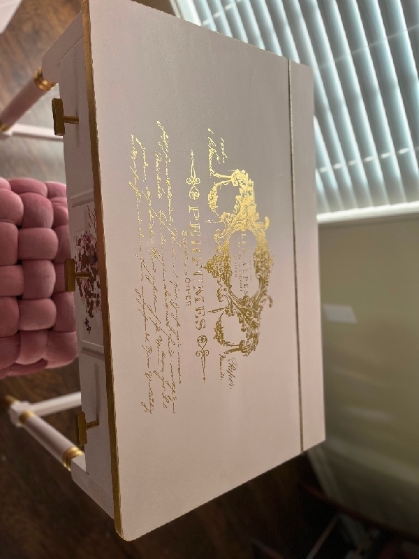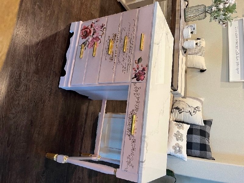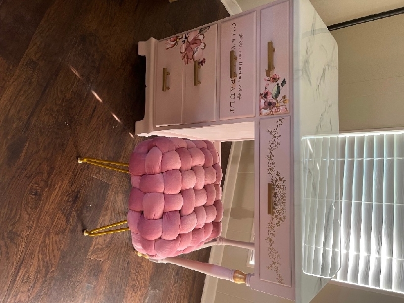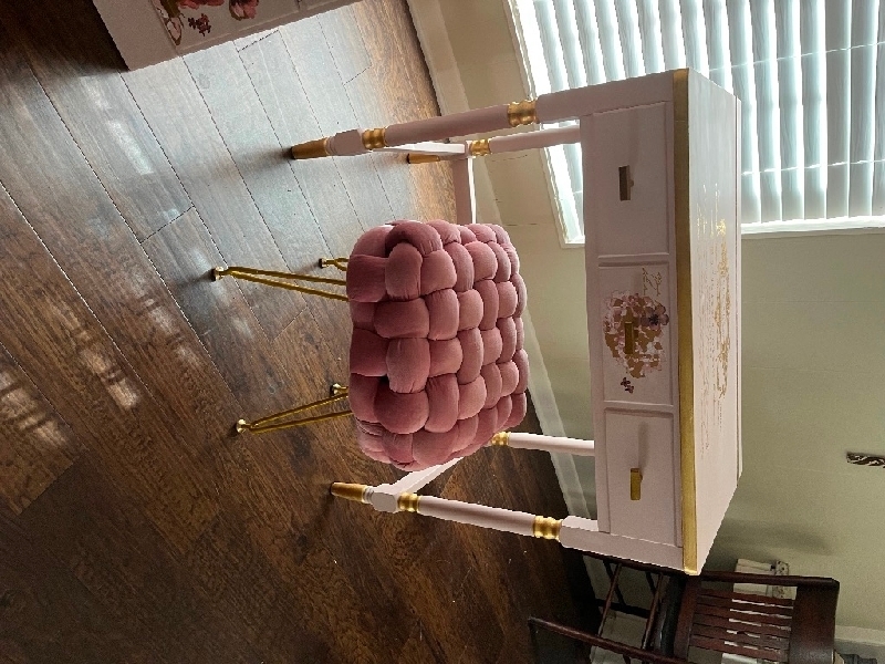 Furniture set! Solid wood 3 piece bedroom set. Blush pink with gold leaf details. Marbled epoxy resin tops on desk and book case. Stool is included in package! Vanity 30x17x30 (comes with seat) Desk 44x18x30 Book case 24x18x78 Contact me at 346 848 1730 1,000
