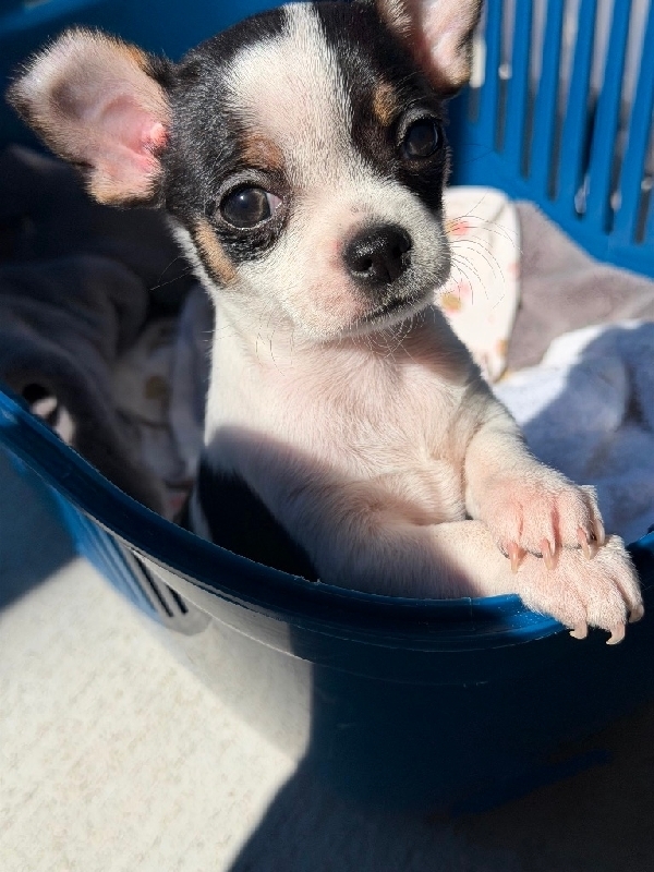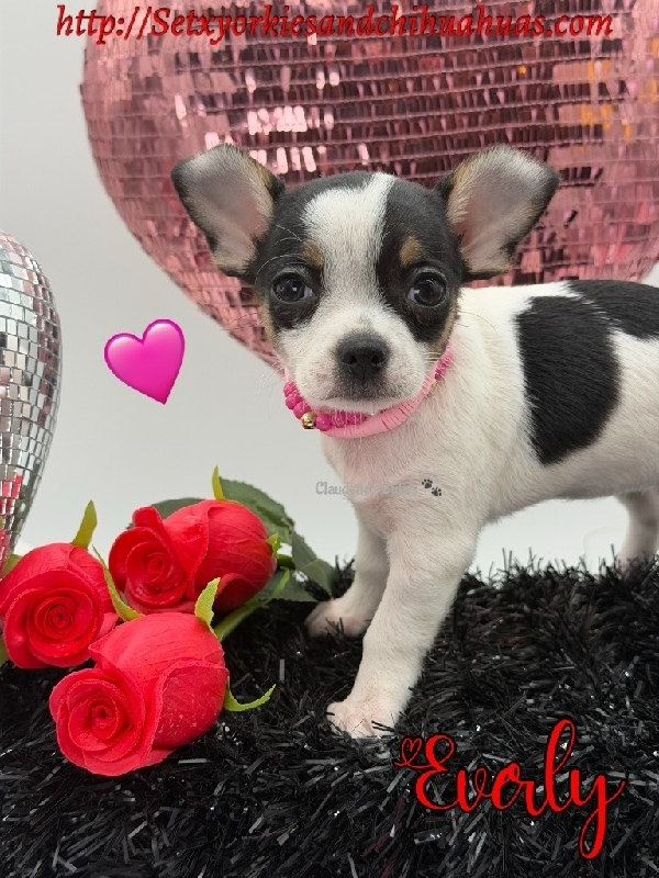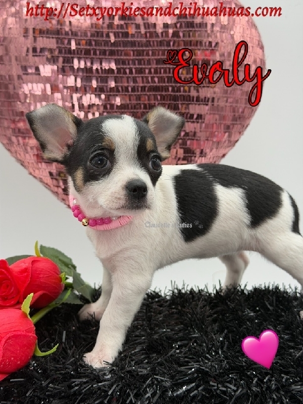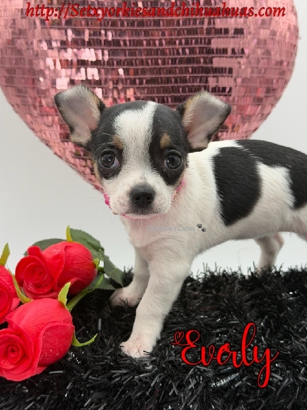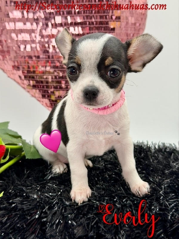 Gorgeous AKC Female White with Black Applehead Chihuahua Sweet Miss Everly is a dream baby, perfect in every way. Charting 4 to 4 1/2 pounds, AKC Registered, perfect Gorgeous White with Black Markings color, the best temperament, an absolute sweetheart. Her DOB is 12/13, she has had her first round of vaccines, deworming and is already Microchipped. Everly comes with a 3 Generation Pedigree, 30 days is insurance a very nice puppy pack with carrier, blanket, toy, food, collar, bowls etc. This little girl is raised in my home, very well socialized and ready to make your dreams come true. 2800