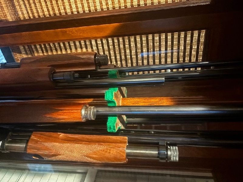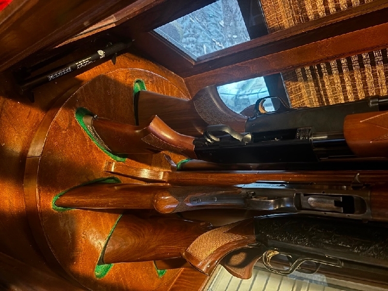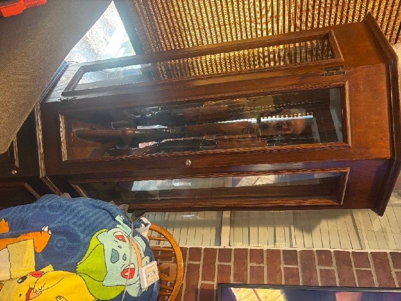 case hexagon glass shape with cabinet below with locking doors and Lazy Susan for eight rifles with heater in Cabinet, paid $2200, selling for $1200 $1200