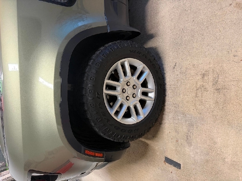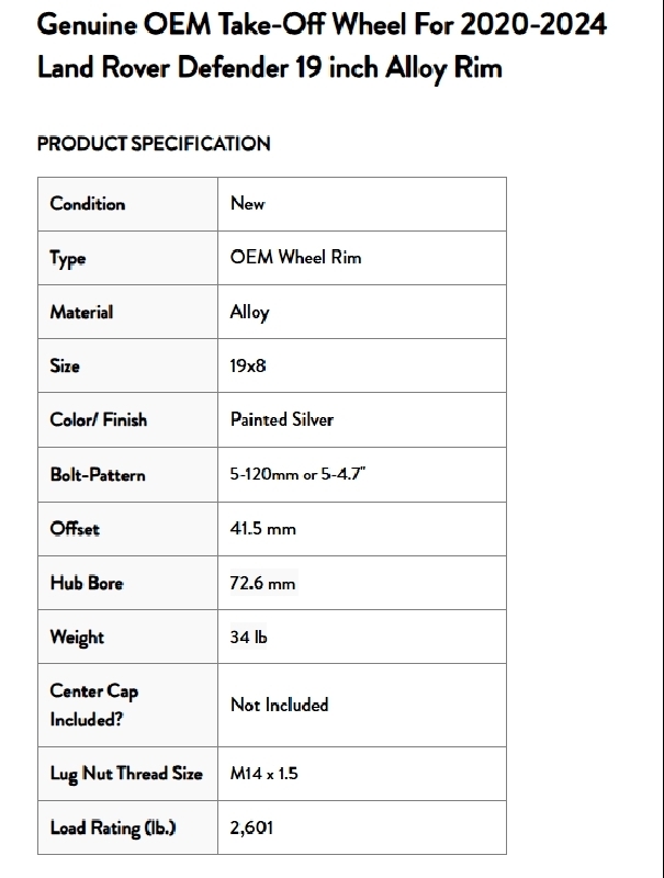 Land Rover OEM Wheels - Full Set of (5) These are factory take-offs from a 2020 Land Rover Defender. Wheels are 19" and are finished in sparkle silver. They are in overall excellent condition and still have some remaining tread on the Goodyear Wrangler Duratrac tires. The spare tire/wheel maybe has 100 miles on it and is in perfect condition since it was protected with the spare tire cover. Tires were purchased in 2023 and are not the original tires that came with the vehicle. The spare tire is also a matching Goodyear Duratrac Tire. TPMS is included with all (5) wheels. Comparing to similar Ebay posts, these wheels should fit any other Land Rover model as well. All that you will need to mount the wheels is a set of lug nuts. Info is provided in picture regarding lug nut size and they can be found easily on Ebay. Better pictures can be obtained, the pictures of the wheels on the vehicle were taken ~ 2 weeks prior to new wheels/tires being installed. Take-offs are being stored indoors & please call or text with any questions! $550