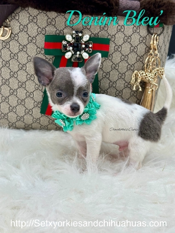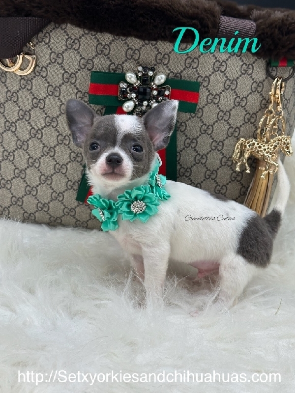 Male Registered Chihuahuas Little Denim & Maizy are tiny Stunning male Blue & White and Fawn & White male Chihuahuas. They are AKC Registered, will come with first vaccination, deworming, and wee pad trained. These little fellows will be Microchipped and is such a loving little boys. Denim or Maizy could be your little prince, I am in Beaumont Tx text or call 409-791-3944. Denim & Maizy come checked and a very generous puppy package, 1st set of puppy vaccinations! Just stunning ! They are the whole package! Healthy and all puppy shots and so cute & love to cuddle ! Spoiled little baby boys ! New current pics are on the ad just taken today ! They will be about 4 lbs. Comes with his food, vet records, shot record, toys and favorite blanket! Denim is $2000!! 1800