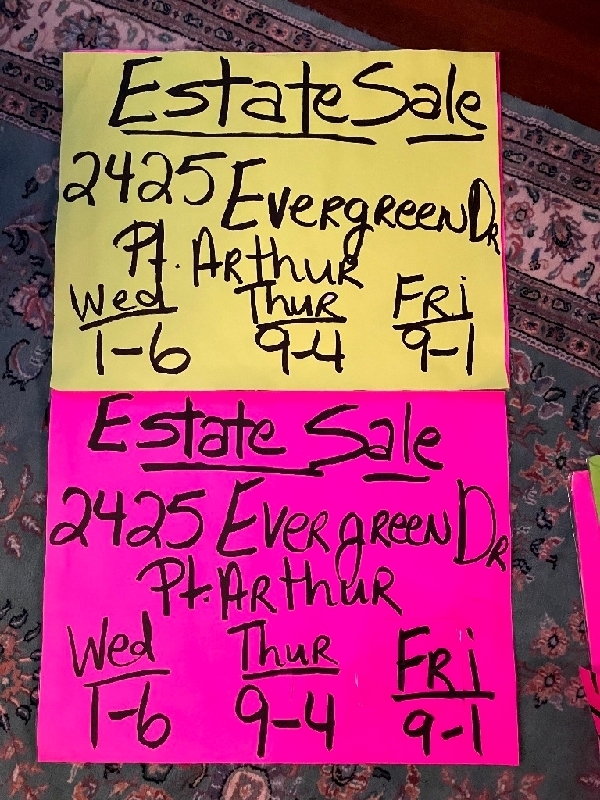 Men This Sale is for your -- but bring your Wife too!! Location: 2425 Evergreen Drive Port Arthur, Texas 77642 (Between Rosedale and Las Palmas near Griffing Drive in Griffing Park.) Days and Times: Wednesday, April 29th – 1 p.m. to 6 p.m. Thursday, April 30th – 9:00 a.m. to 4 p.m. Friday, May 1st – 9:00 a.m. to 1 p.m. Men: There are tools of every shape and size – super big and really little, nuts, bolts, clamps, screws, tool boxes, paint brushes, bolt cutters, oil, oil filters, fish tank supplies, household products, old License Plates, Ladders, a million Odds and Ends. Ladies: Gorgeous Pots and Plants - every size and shape, yard tools, soil, eclectic items for outside, artificial Poinsettias, Tomato Stakes. Family Fun! Hundreds of DVD, CD's and VHS Tapes and a few Albums too! DVD and VHS Players!