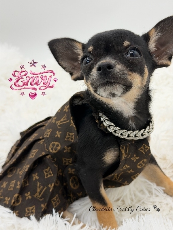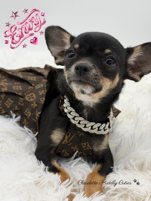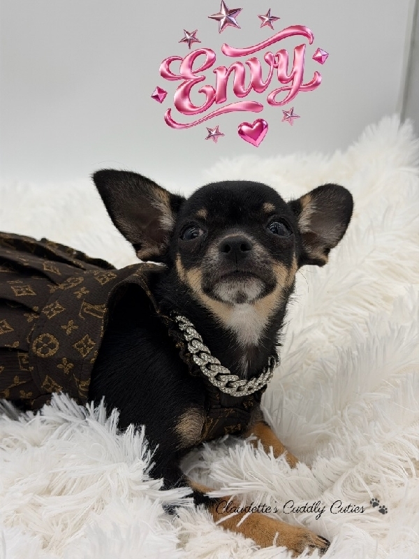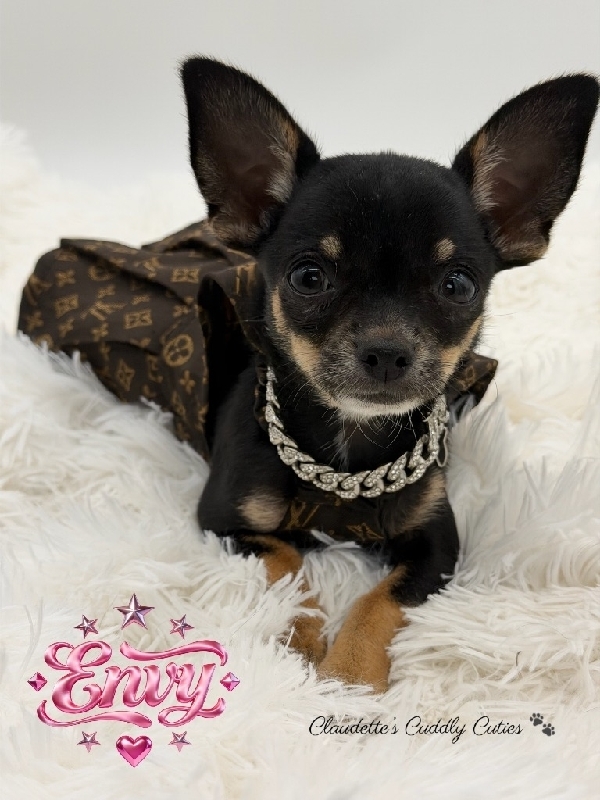 MICRO AKC Female Chihuahua Sweet Miss Envy is a dream baby, perfect in every way. Charting 3 to 3 1/2 pounds, AKC Registered, perfect Gorgeous Black Tri color, the best temperament, an absolute sweetheart. Her DOB is 12/13, she has had her first round of vaccines, de- worming and is already Microchipped. Envy comes with a 3 Generation Pedigree, 30 days is insurance a very nice puppy pack with carrier, blanket, toy, food, collar, bowls etc. This little girl is raised in my home, very well socialized and ready to make your dreams come true. 2200 2200