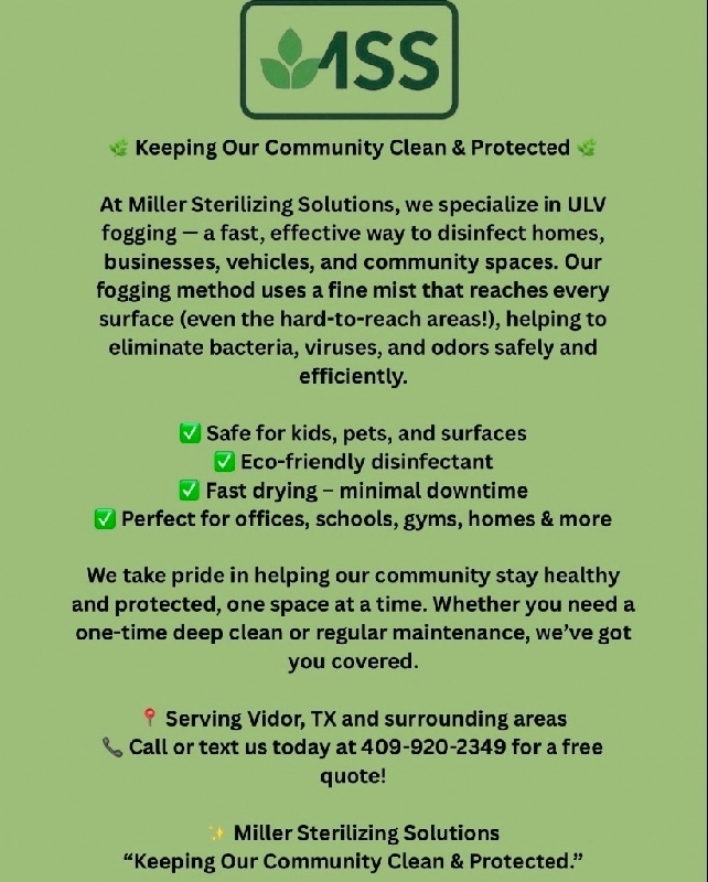 Miller Sterilizing Solutions Keeping Our Community Clean & Protected At Miller Sterilizing Solutions, we specialize in ULV fogging - a fast, effective way to disinfect homes, businesses, vehicles, and community spaces. Our fogging method uses a fine mist that reaches every surface (even the hard-to-reach areas!), helping to eliminate bacteria, viruses, and odors safely and efficiently. V Safe for kids, pets, and surfaces Eco-friendly disinfectant Fast drying - minimal downtime Perfect for offices, schools, gyms, homes & more We take pride in helping our community stay healthy and protected, one space at a time. Whether you need a one-time deep clean or regular maintenance, we've got you covered. 9 Serving Vidor, TX and surrounding areas Call or text us today at 409-920-2349 for a free quote! Miller Sterilizing Solutions "Keeping Our Community Clean & Protected."