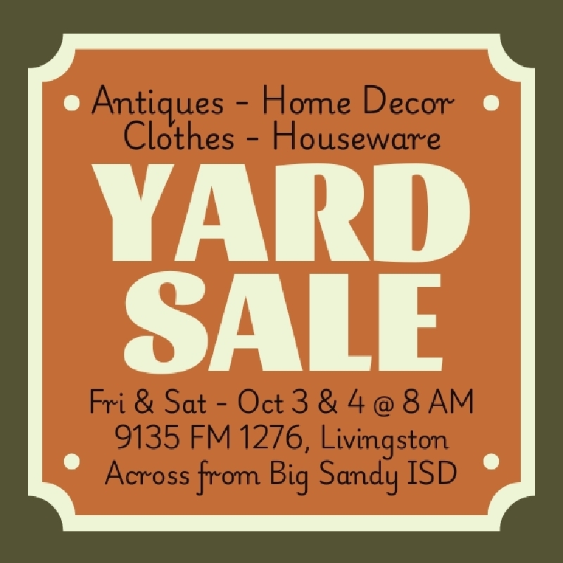 Moving in and clearing out! Home decor, antiques, good clothes, houseware.. This weekend, Oct 3 & 4, beginning at 8AM. Across from Big Sandy ISD. 9135 FM 1276, Livingston.