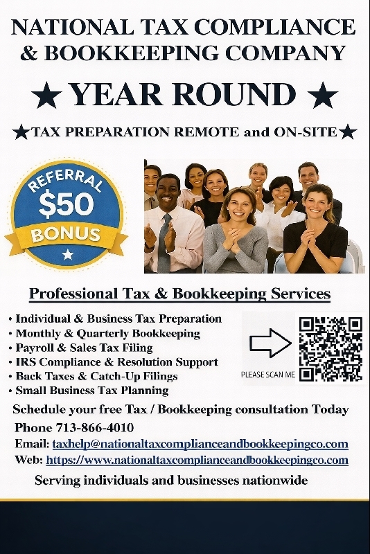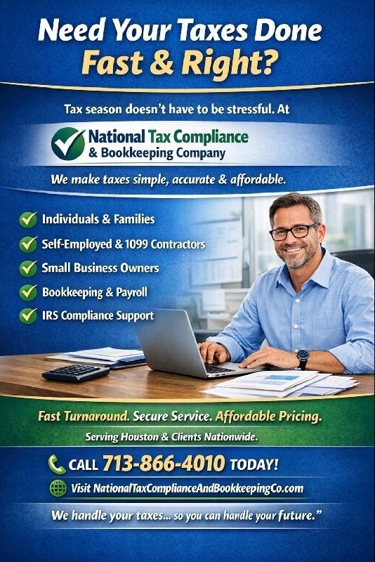 Need Your Taxes Done Fast & Right? Need Your Taxes Done Fast & Right? Tax season doesn't have to be stressful. At National Tax Compliance & Bookkeeping Company We make taxes simple, accurate & affordable. Individuals & Families Self-Employed & 1099 Contractors Small Business Owners Bookkeeping & Payroll IRS Compliance Support Get up to $8000 Next Day! Fast Turnaround. Secure Service. Affordable Pricing. On-site and remote service options CALL 281-656-6530 TODAY! Visit NationalTaxComplianceAndBookkeepingCo.com "We handle your taxes… so you can handle your future." Badge on the right: REFERRAL $50 BONUS