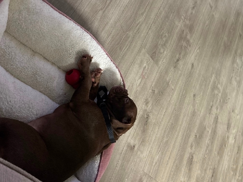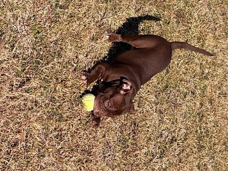 Pocket bully , chocolate make. Nothing wrong with him just can't keep him in our current place. Great pup. 4 months old. Shots up To date. Will come with food kennel and bowls and a small bed. 350