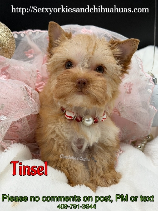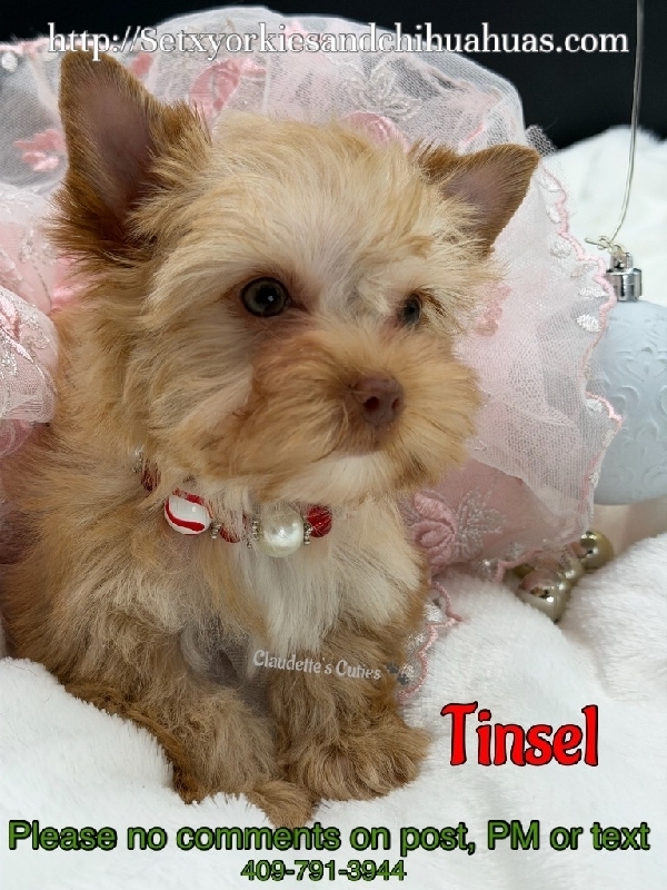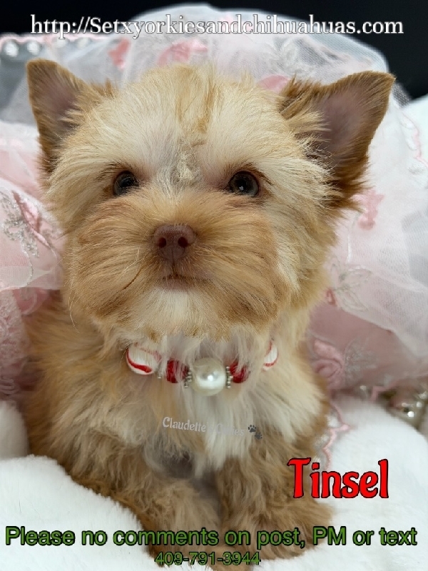 Precious Golden Female Yorkie Little Tinsel is Stunning Golden Sable colored Stunning female Yorkie baby girl. She is AKC Registered, will come with first vaccination, deworming, tail docked, dewclaws removed and wee pad trained. She is Microchipped and is such loving little girl. This could be your little princess , I am in Beaumont Tx text or call 409-791-3944. She has been vet checked and with 1st set of puppy vaccinations! Just stunning! He is the whole package! Healthy and all puppy shots and so cute & love to cuddle ! Spoiled little baby girl! New current pics are on the ad just taken today! She will be about 4 lbs. Comes with 4- generation pedigree and a very generous puppy package, food, vet records, shot record, toys and favorite blanket! 2800