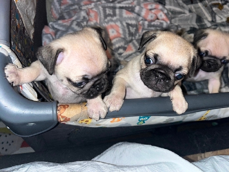 Pug fur Babys I have 8 week old Pug Puppies. They r fawn and I have boys and girls . They r up to daye on their vaccinations and been wormed. They r CLC registered The parents are on site. The puppys are good around other dogs and children. They r pad trained. . 500