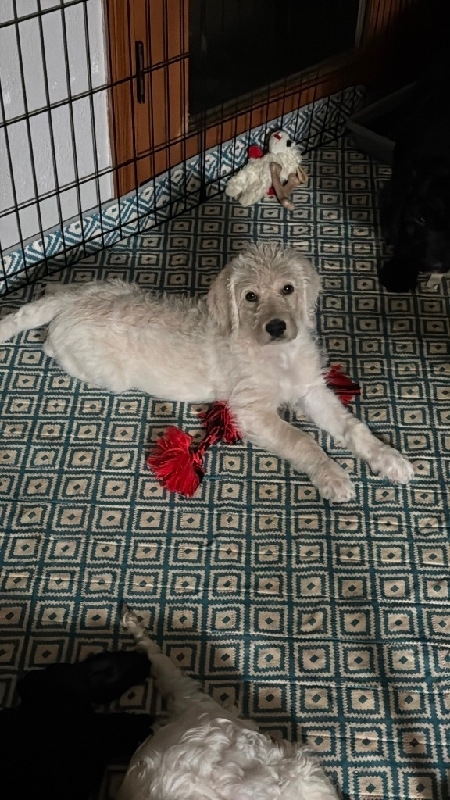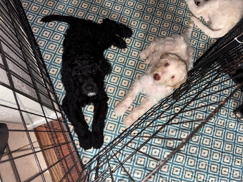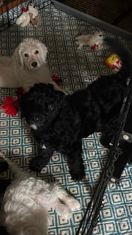 Puppies F1B Labradoodles 8 weeks old, have had shots and ready to go to new homes. 3 girls 1 boy. 2 white girl 1 black girl 1 black boy. Comes with papers, and everything needed to take them home. Can meet with puppy if needed. Call me for more information. 713-829-7161 1000