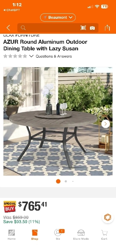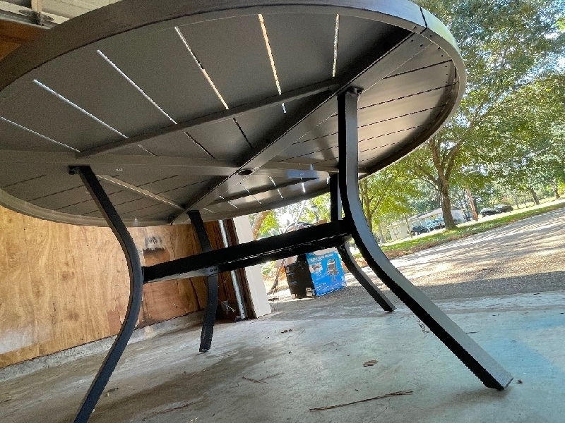 Round Table with Lazy Susan Outdoor aluminum round table. Like new. Garage kept. Has umbrella holes, lazy Susan, slated tabletop with wood grain design. Originally $850 from Home Depot. Pickup in Beaumont 500