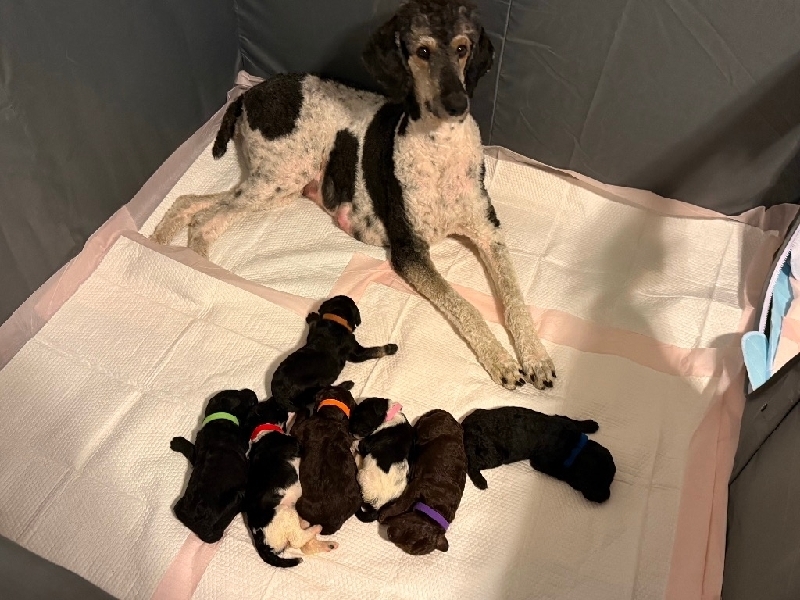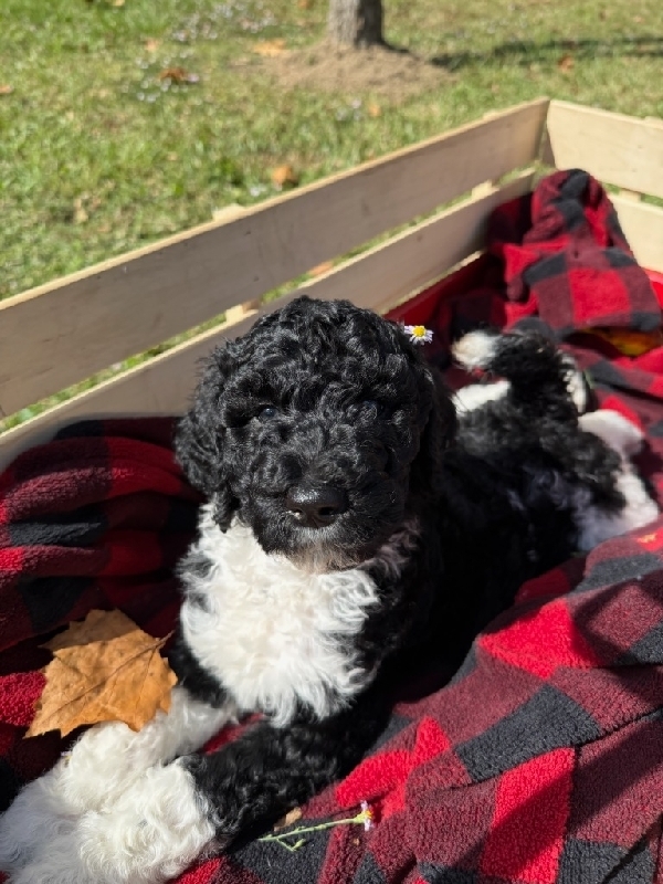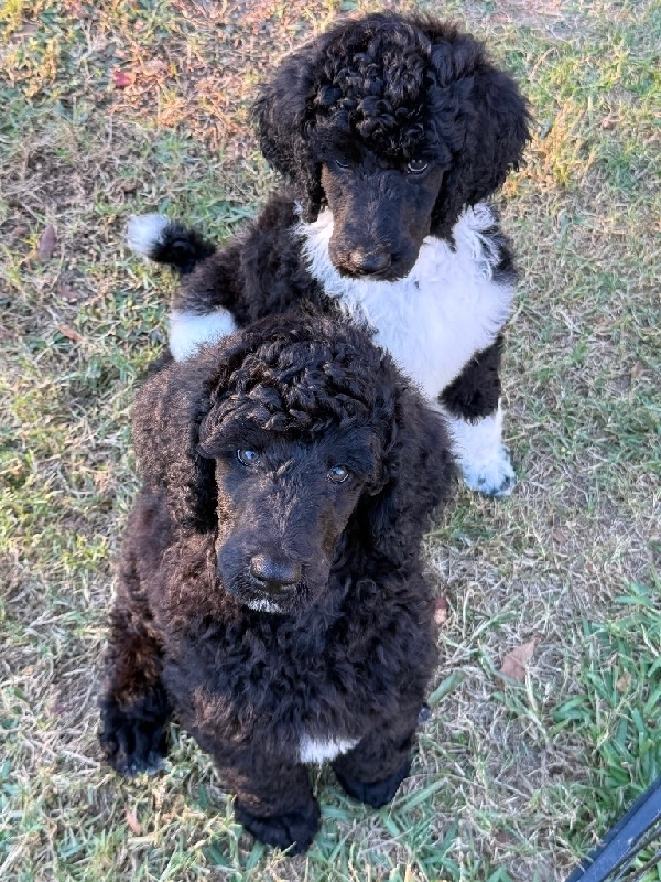 Standard Poodle Puppies born 9/12/25 I have 3 males and 1 female AKC registered standard poodle puppies ready for their furever homes. They are up to date on shots and are potty training to go outside. They are also learning to sit for treats already. They all have sweet personalities and are very loving and curious, of course. Please call or text for additional info or pictures/videos if interested in a particular puppy. The female is the black and white parti puppy. The other 3 are males. $1500