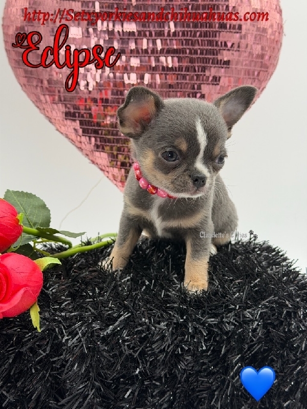 Stunning AKC Lilac Tri Colored Male Applehead Chihuahua Little Eclipse is a dream baby, perfect in every way. Charting 4 to 4 1/2 pounds, AKC Registered, perfect smushy face, short legs Gorgeous Lilac Tri color, the best temperament, an absolute sweetheart. His DOB is 12/13, he has had his first round of vaccines, deworming and is already Microchipped. Eclipse comes with a 3 Generation Pedigree, 30 days is insurance a very nice puppy pack with carrier, blanket, toy, food, collar, bowls etc. This little boy is raised in my home, very well socialized and ready to make your dreams come true. 2800