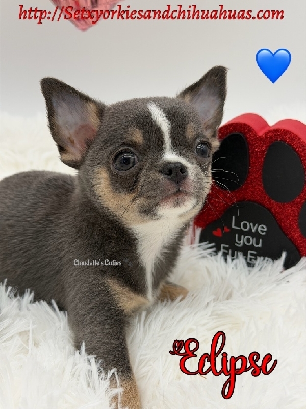 Stunning Lilac Tri Applehead Male Chihuahua Little Eclipse is a dream baby, perfect in every way. Charting 4 to 4 1/2 pounds, AKC Registered, perfect smushy face, short legs Gorgeous Lilac Tri color, the best temperament, an absolute sweetheart. His DOB is 12/13, he has had his first round of vaccines, deworming and is already Microchipped. Eclipse comes with a 3 Generation Pedigree, 30 days of insurance a very nice puppy pack with carrier, blanket, toy, food, collar, bowls etc. This little boy is raised in my home, very well socialized and ready to make your dreams come true. 2800
