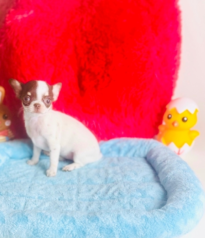 Teacup Lollipop short coat, Applehead female Chihuahua. This little girl is ready to go. She's been vet checked and has her first set of shots. Documentation will be provided. We're located in Houston Texas in the clear Lake area and allow pick ups in person at the police station for safety. Call 281-898-5845 for more information on Lolli. Chocolate, White & Tan Tri. Pictures taken March 25 of 2026. Applehead, Female, Teacup puppy. 3850