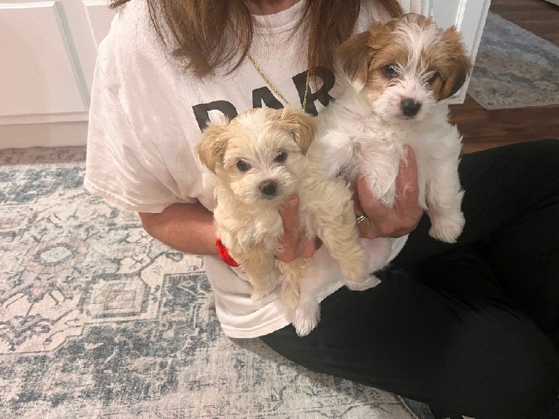 Yorkie-Pom Female- runt of litter. 3/4 Yorkie and 1/4 Pomeranian. Dad is AKC Yorkie and 5lbs. Dad rare Colors -white , gold and tan. Puppies coloring like dad. They are generally small standing 6 to 10" tall. Expected to be less than 5lbs. Tan and white. Coat is thick like Pom. First shots and worming. Dew claws removed and tail docked. Ready for forever home. Dad is AKC Yorkie and mom is 50/50 Yorkie/Pomeranian Born 12/27. $950